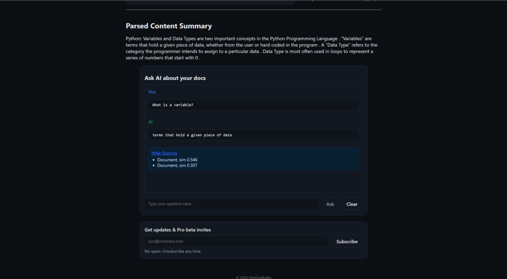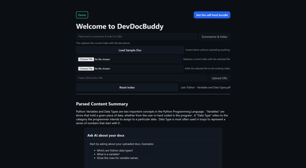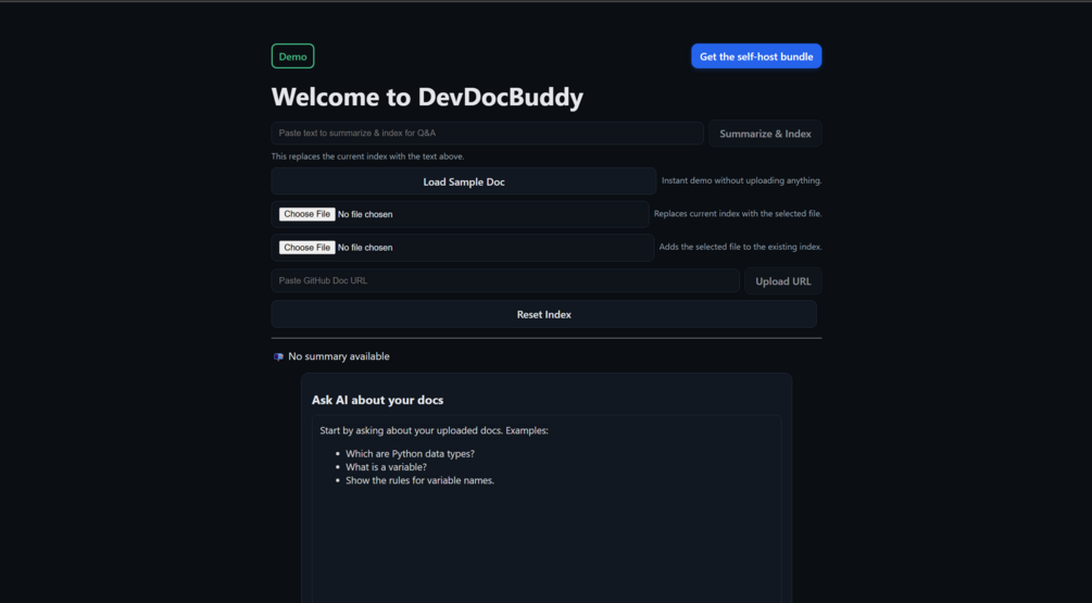 DevDocBuddy turns dense developer documentation into answers. Upload a PDF/Markdown or paste a GitHub URL, get a plain-English summary, then ask questions with citations.